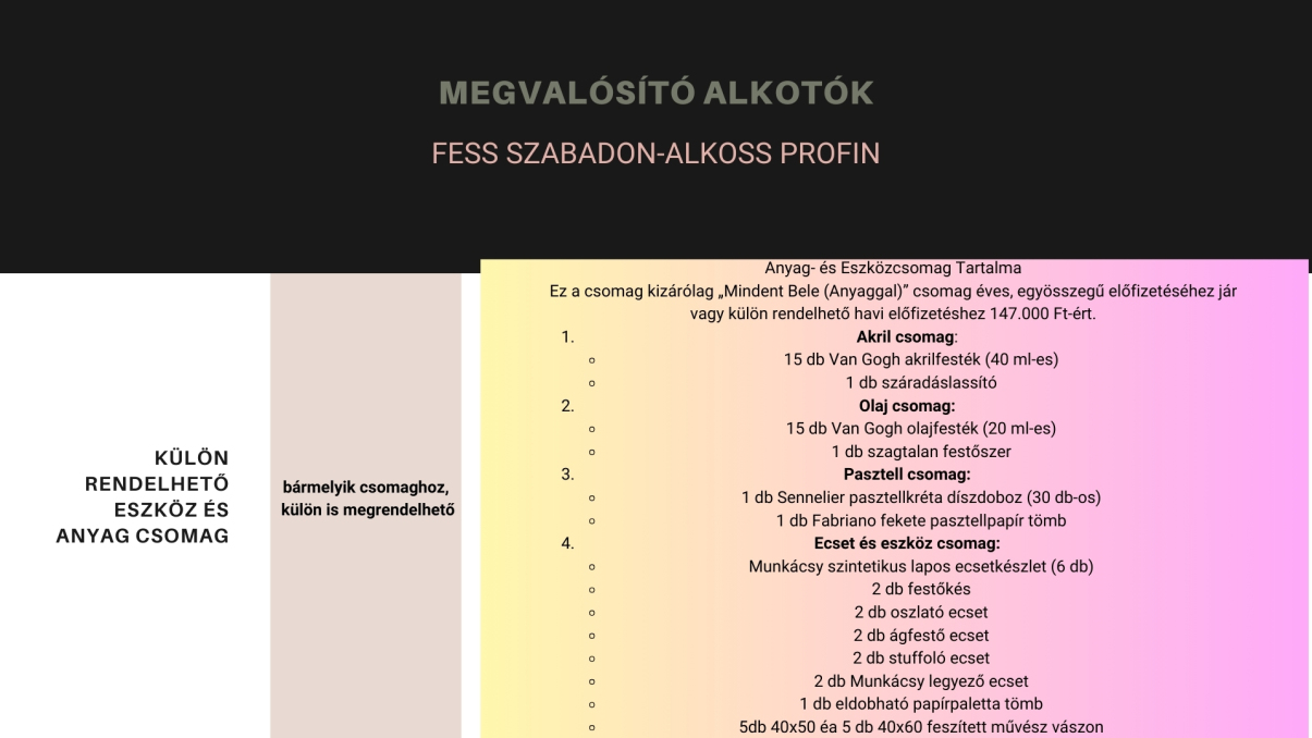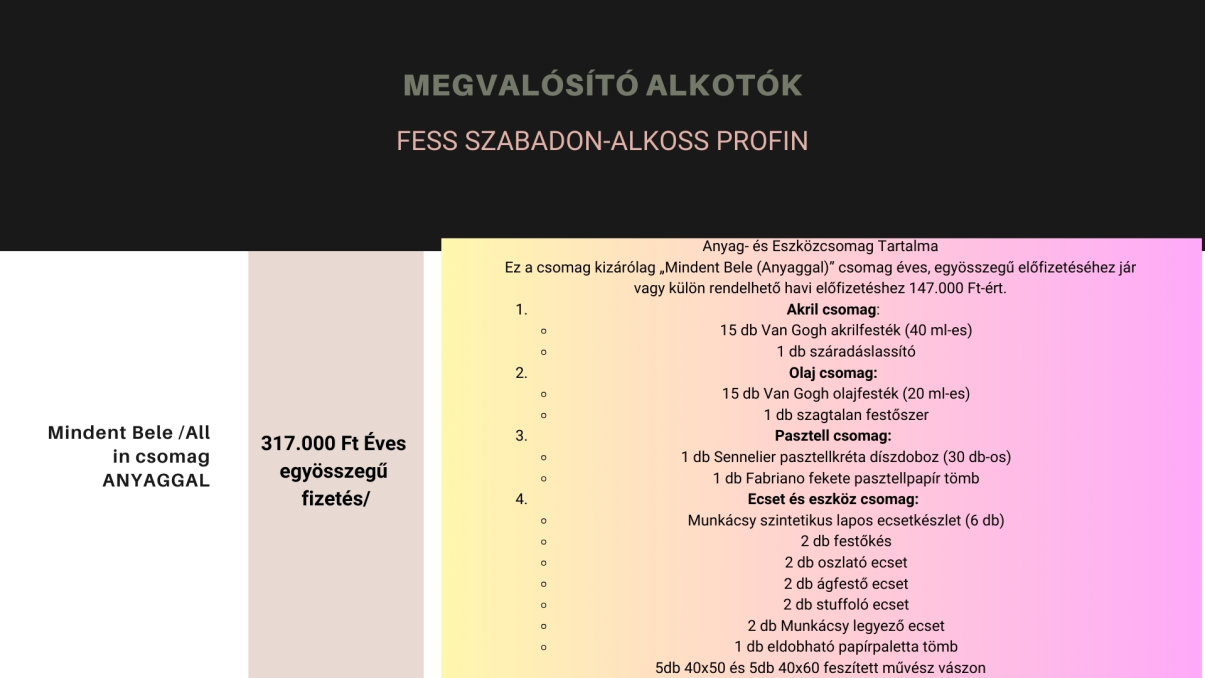 Ez a csomag minimum 3 évre elegendő leckéket + egy komplett anyag csomagot tartalmaz, rengeteg inspirációval és tudnivalóval, jelenleg több mint 150 festés videóval és havonta bővülő tananyagokkal.