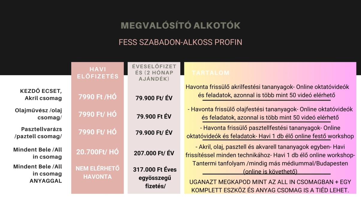 Ez a csomag minimum 2 évre elegendő leckéket tartalmaz, rengeteg inspirációval és tudnivalóval, jelenleg több mint 100 festés videóval és havonta bővülő tananyagokkal.