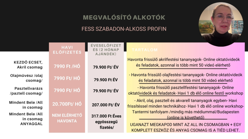 Már több mint 10 éve dolgozom azon, hogy személyes és online oktatásinkon is a legtöbbet tudjuk nyújtani a hozzánk forduló, festeni vágyó alkotóknak.